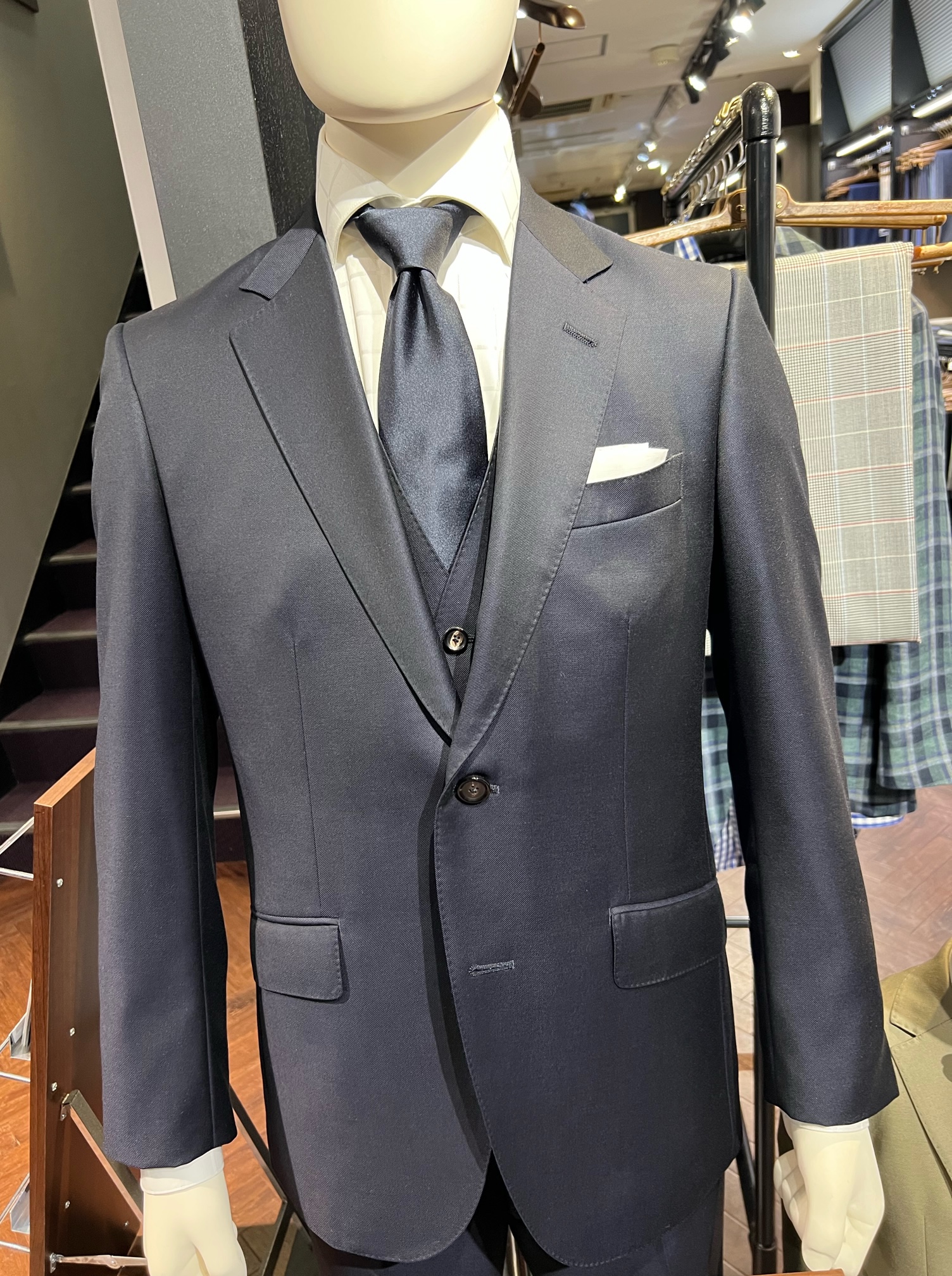 紺色の3ピースです。