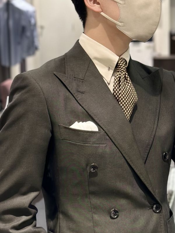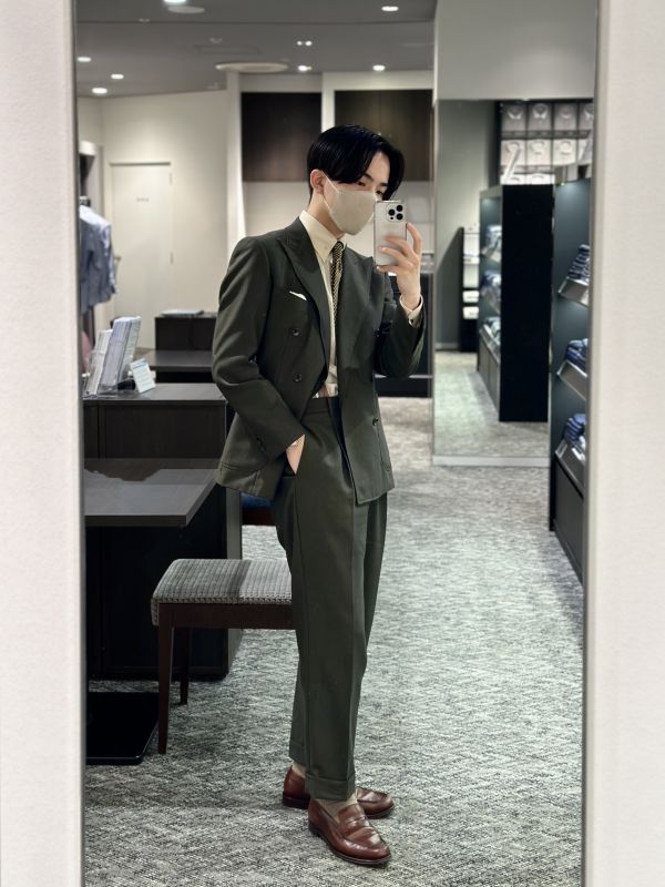 イギリスブランド ”JOHN・FOSTER” の生地で仕立てた、モスグリーンのダブルスーツでございます🌵