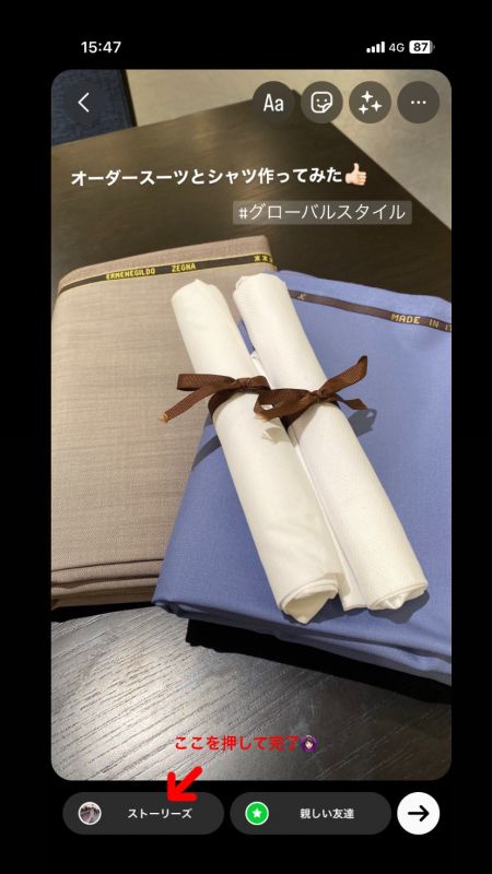 ②ストーリーズ作成画面からセレクトした生地の写真などを撮影する