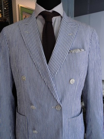 シアサッカーのダブルスーツです!夏にダブルスーツ!もう暑さとか我慢ですねー。笑
