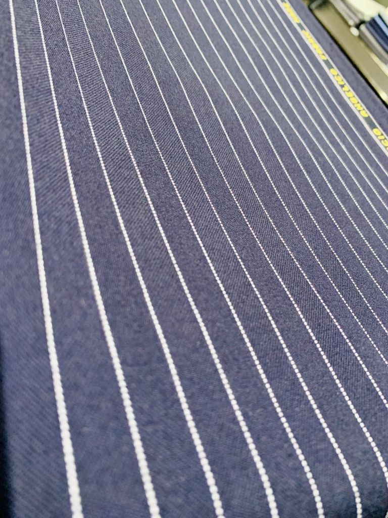 続いて少々奇抜なネイビーのストライプのスーツ地。