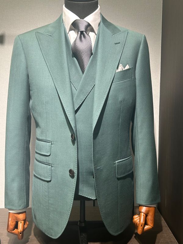 既製品では中々見ない個性的な色柄のスーツ生地の中でも緑色のスーツの注文を承ることが多く、