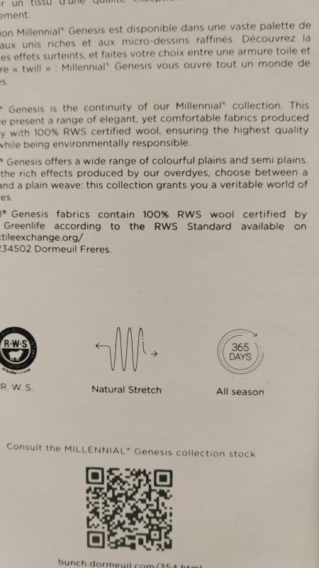 二つ目はSuper110’sの原料を使用したヤーンダイの綾織りでピュアウールナチュラルストレッチのプレーンカラー織柄バージョン