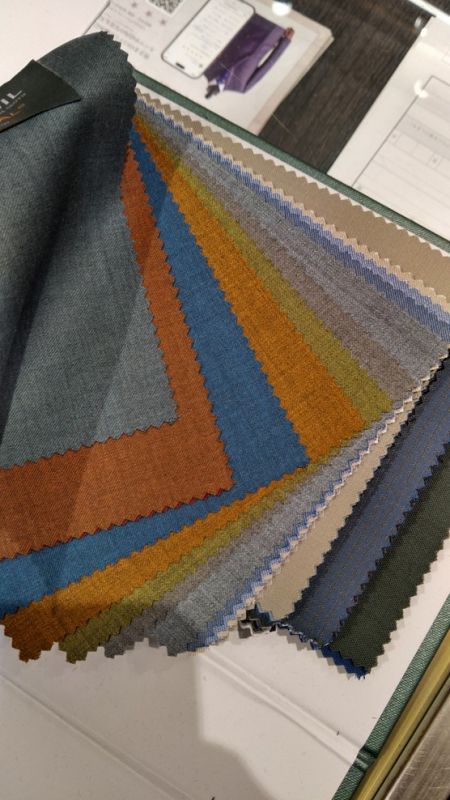 ひとつはSuper110’sの原料を使用したピースダイの綾織りでピュアウールナチュラルストレッチのプレーンカラーバージョン