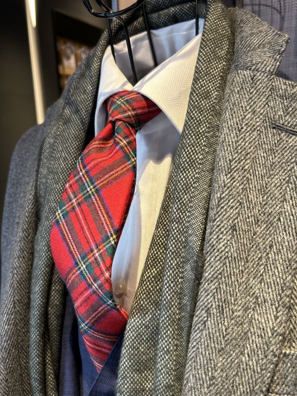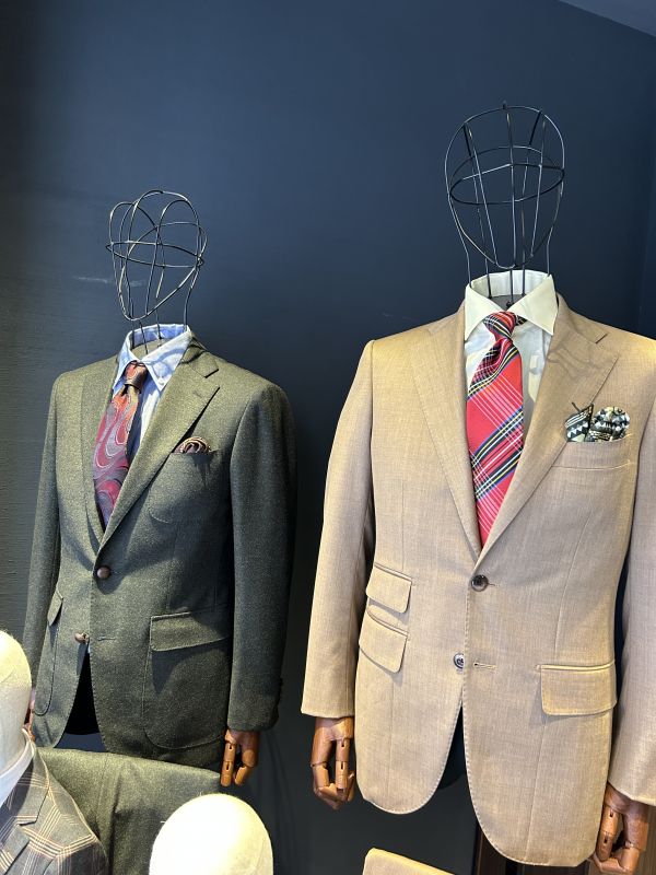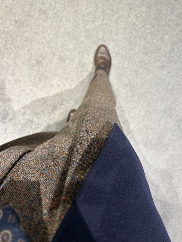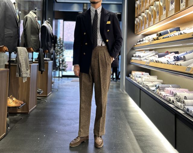 本日は、紺ブレにブラウンのツイードパンツで出勤しております。