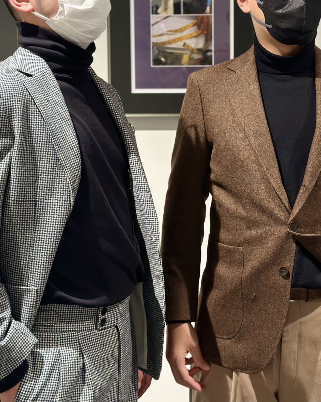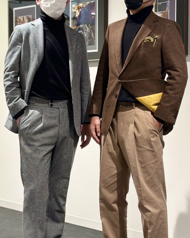 フランネルスーツ(写真左満原さん)やブラウンベースのジャケパン(写真右大亀さん)はかなりカジュアルなアイテムで