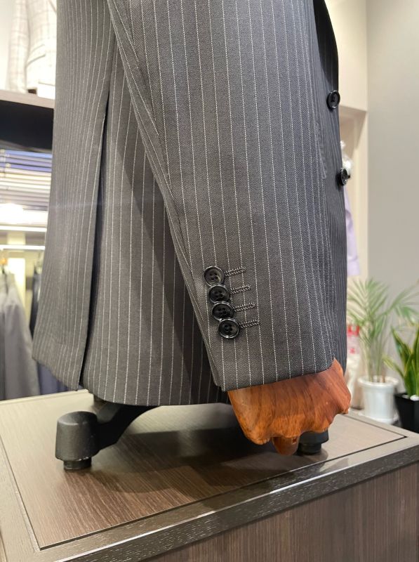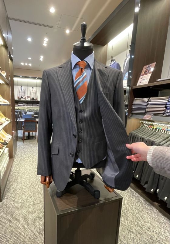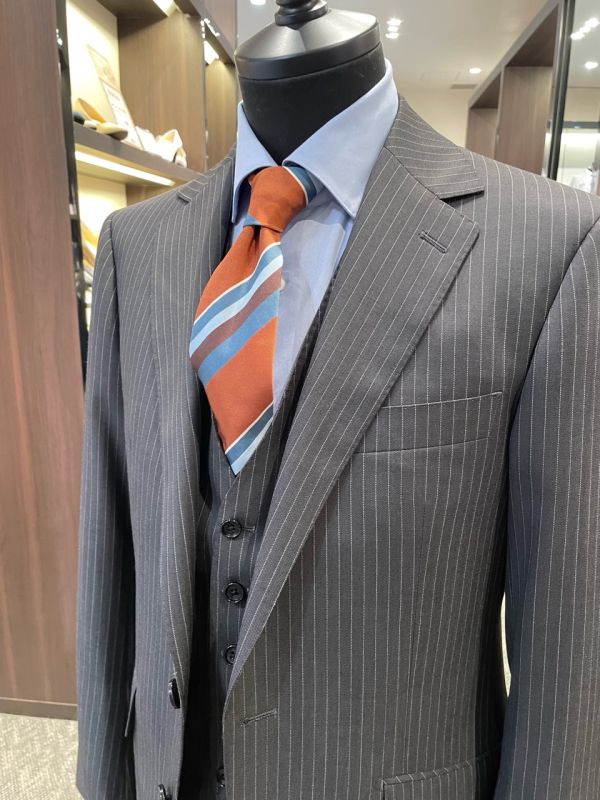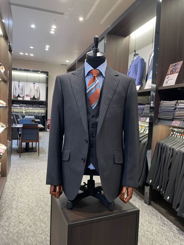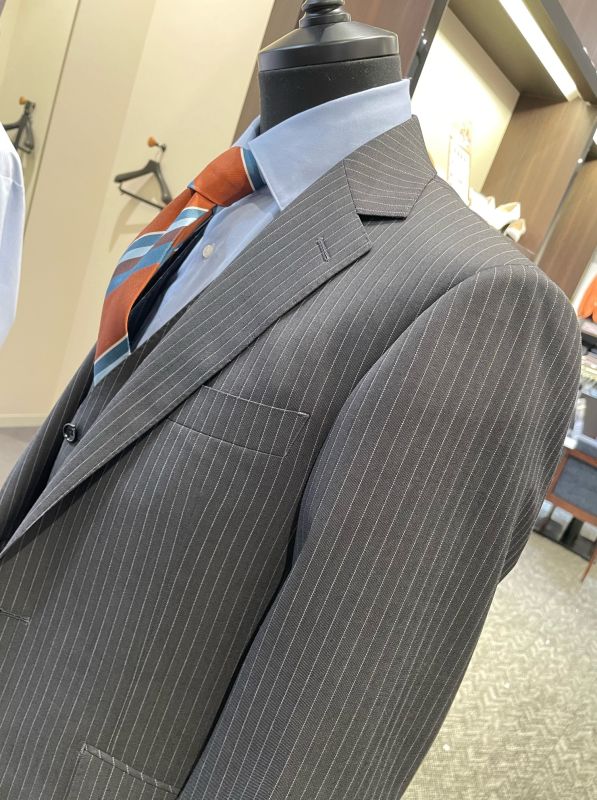 こちらのスーツは線が細めですが、白いラインでしっかりと入っています。