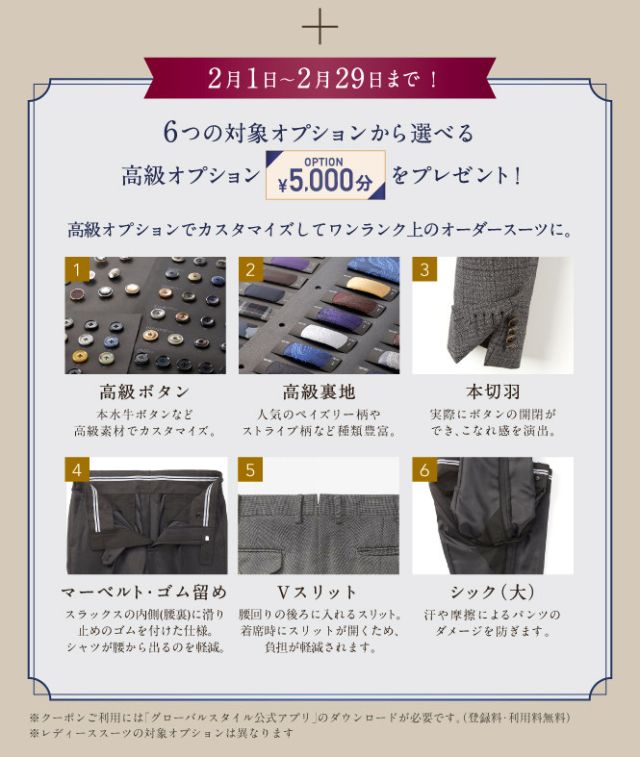 今月は2着以上のご注文と、グローバルスタイル公式アプリのご登録をいただくと