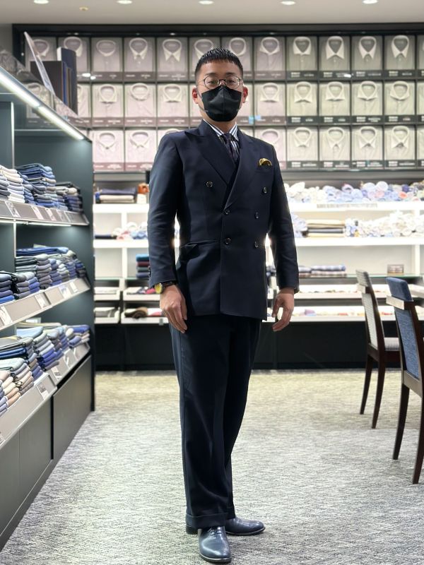 タイトルの通り当店スタッフの大亀さんの美しいダークネイビーのダブルスーツでございます。