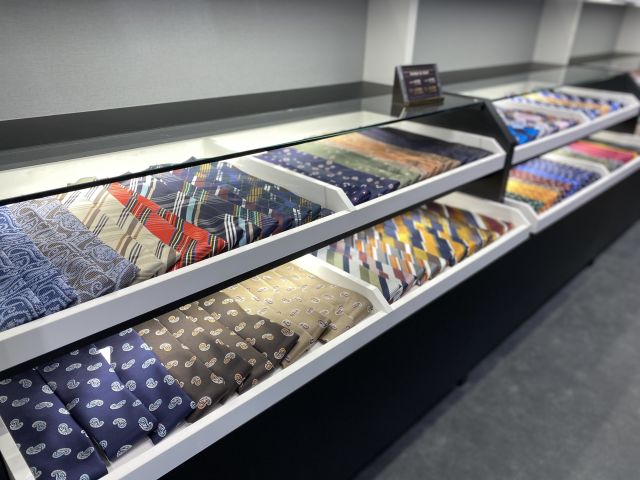 一番手前のブルーグレーのネクタイはかなりオススメで、すぐ無くなりそうですね。