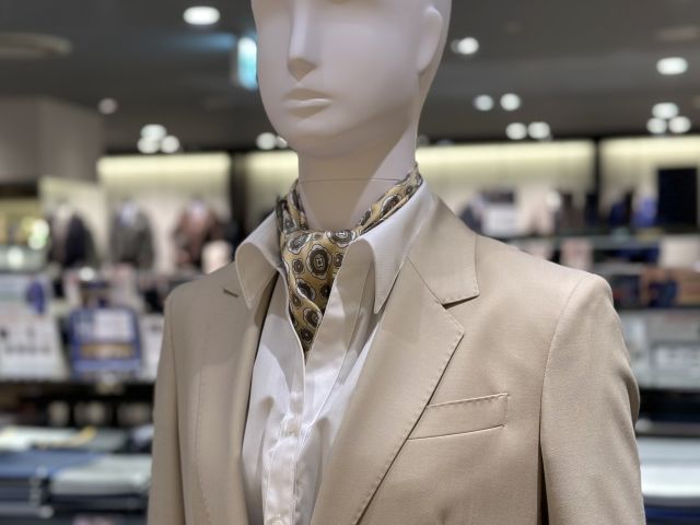 メンズスーツのライトグリーンを拾いベージュとグリーンのスカーフを使用しているので、さりげなくリンクを。