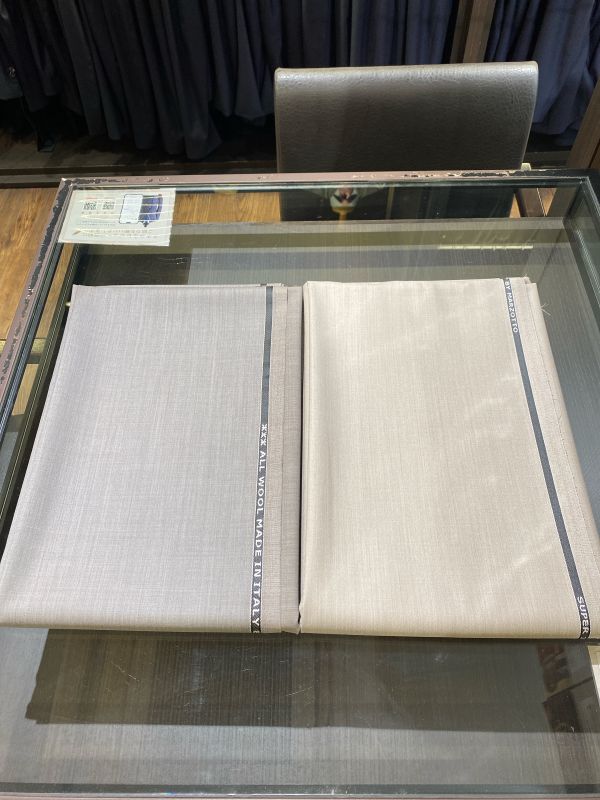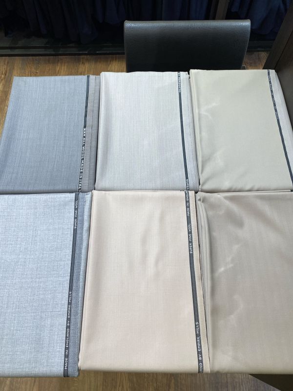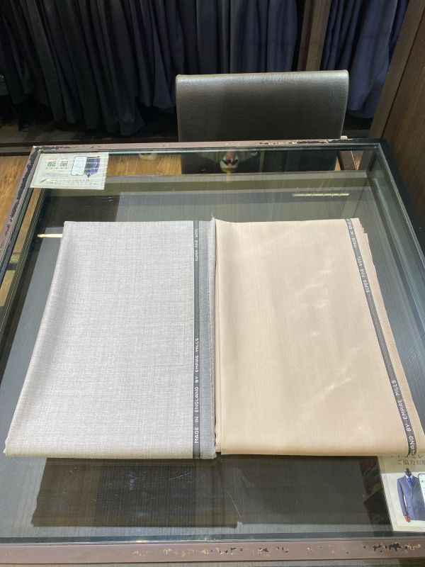 こちらはイギリス生地のブランド、エンパイアミルズのライトグレー(左)とベージュ(右)です。両方とも無地なので、ネクタイやシャツで自由にコーディネートを楽しむことができます。イギリス生地特有のハリコシもあるので、ウールの着心地と耐久性を求める方にもおススメです。