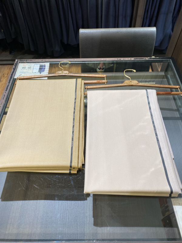 こちらはストレッチが特徴のイタリア生地のブランド、ドラコです。両方ともベージュですが、濃淡の違いで表情が全く違いますね。選んだ生地全て無地でしたね…私の好みが反映されてます笑