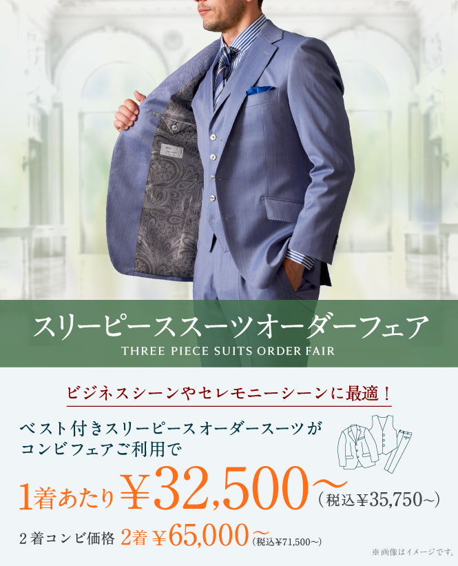 今ならコンビフェアの適用で1着あたり32,500円〜でオーダーでき、アプリ登録で1,000円引クーポンと対象オプション5,000円分をプレゼントいたします。