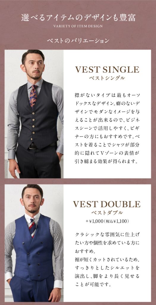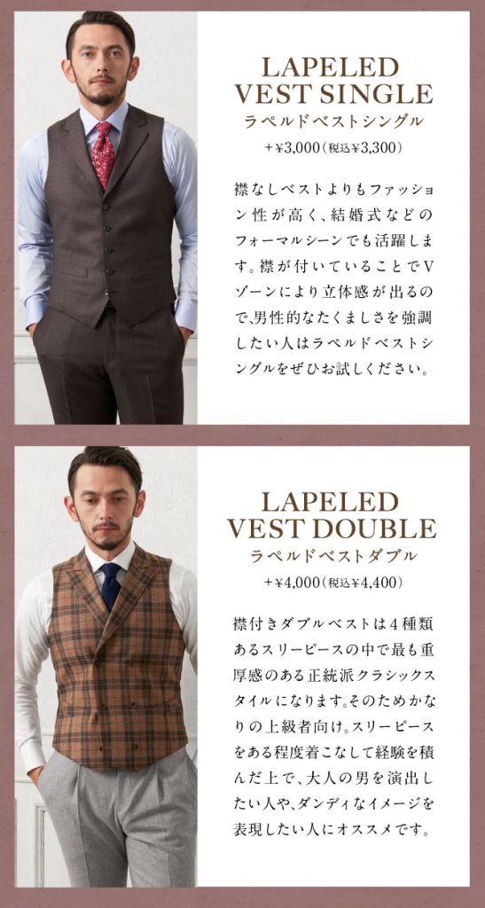 イメージが湧かない時はぜひ店内のトルソーを見てみてください。割と色々なデザインのベストを着ています。