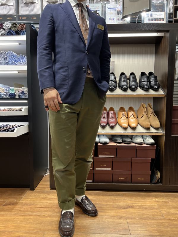 裾口ダブル仕様のカーキのパンツをあわせております。