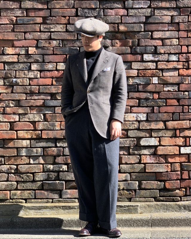 ツイードのズボンと帽子、カントリーシューズにとっくり型のセーターで組んでみました。
