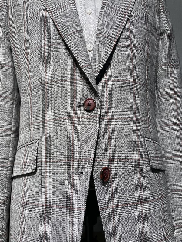 2つボタンのテーラードジャケットなのでモデル自体はかっちりとした印象を与えますが、柄ありの明るいグレーなのでカジュアルな雰囲気になります。