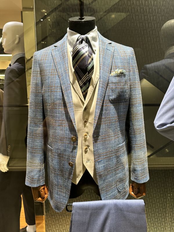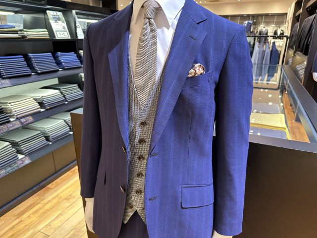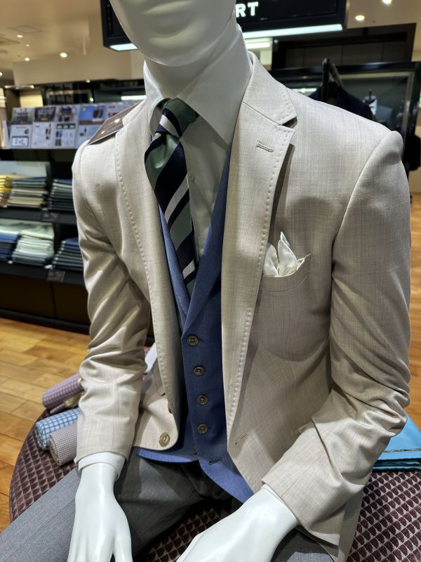 このマネキンの着こなしのように、スーツとベストでお色柄を変えるお仕立てが非常に人気です!!