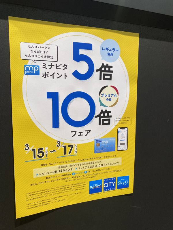ご存知ない方へ、ミナピタポイントとはなんばスカイオ、パークス、Cityで貯まる、使えるお得なポイントです◎