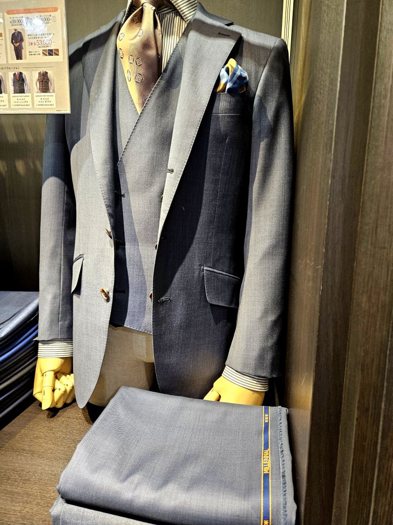 その一歩先には、これまた人気高いブルーグレーを上品に着こなしたマネキンが。