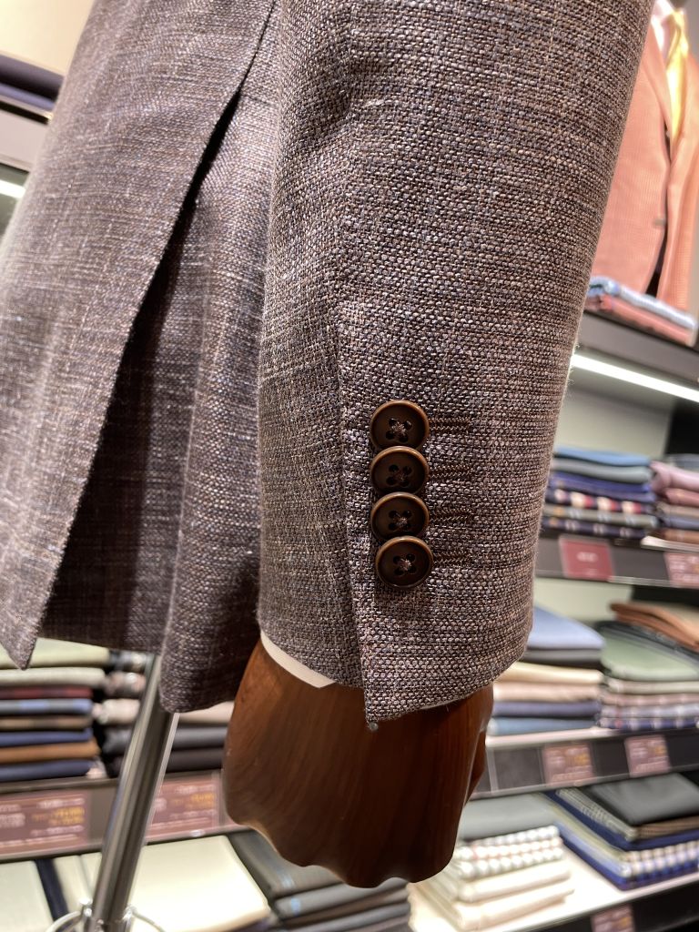 裏地とボタンは同系色のブラウンにすることで統一感が出ていますね!!