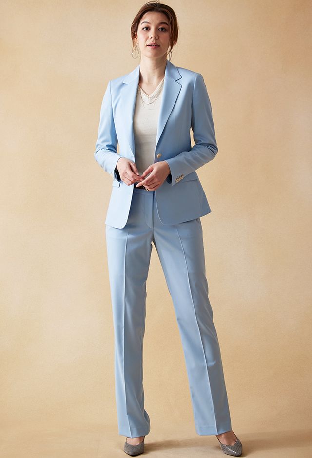 爽やかな淡いブルーの生地です。パンツスーツはもちろんスカートスーツにしても
