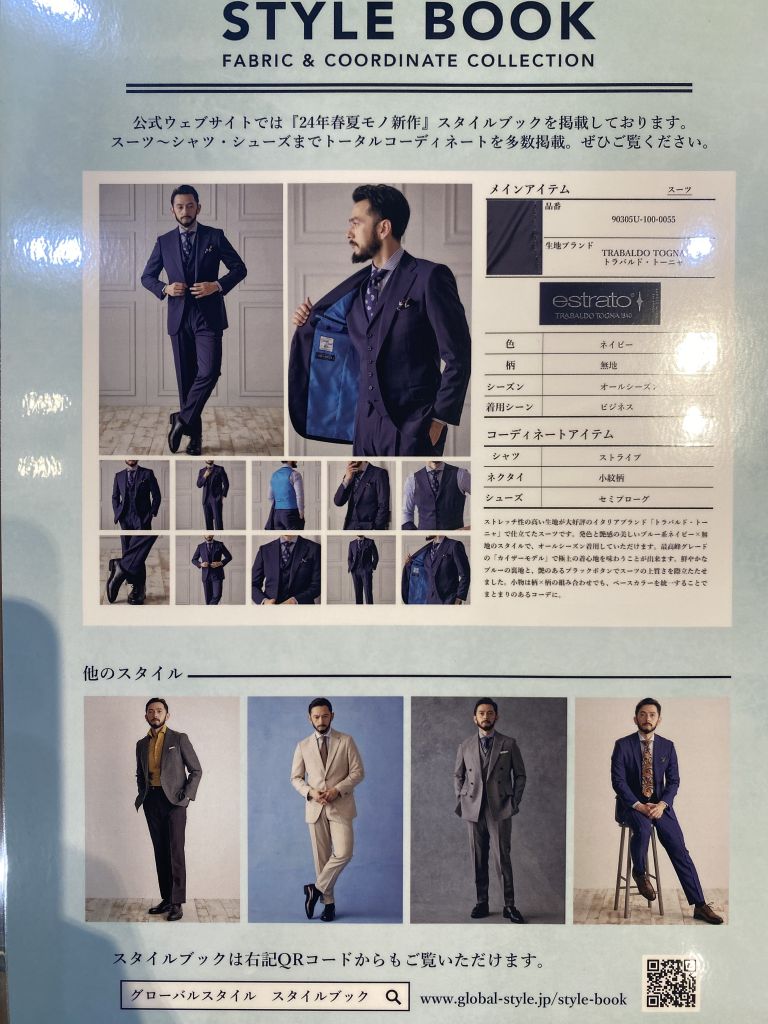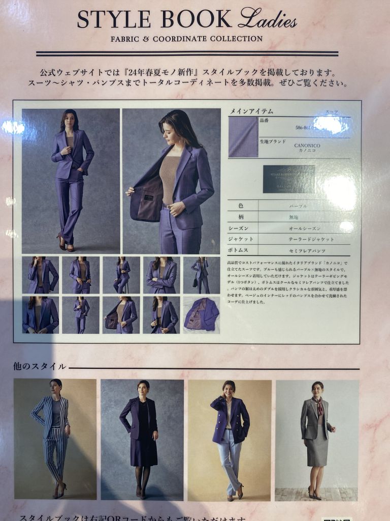 裏面には生地やコーディネートもご説明いたしております。QRコードを読んでHPにもアクセスできますので大変便利です。