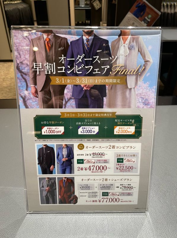 ②3000円分のOP代無料(スーツ1着につき1500円引き)