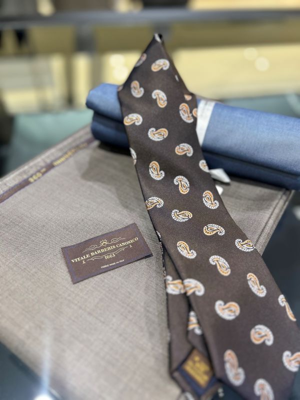 シャツとネクタイはシャンブレーのシャツにブラウン小紋のネクタイです