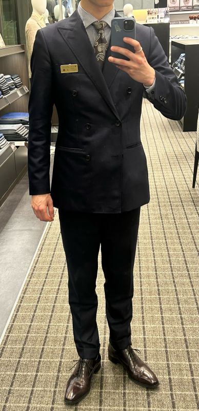 ネイビーの生地なのでシャツやネクタイも合わせやすいかと思います。