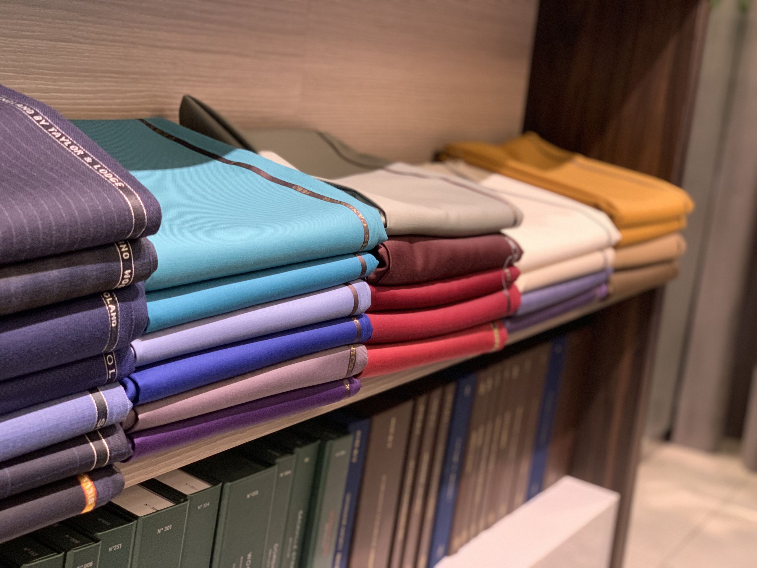女性のオーダースーツの定着が芳しくなかった数年前に比べ、店舗に展開する生地のカラーバリエーションはかなり増えました。