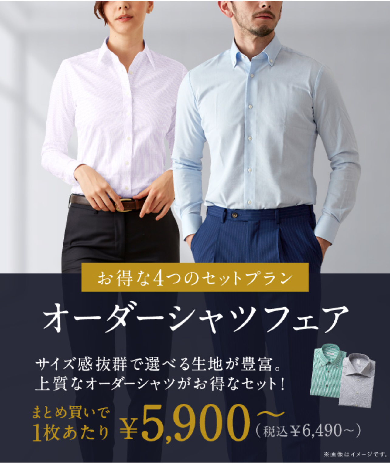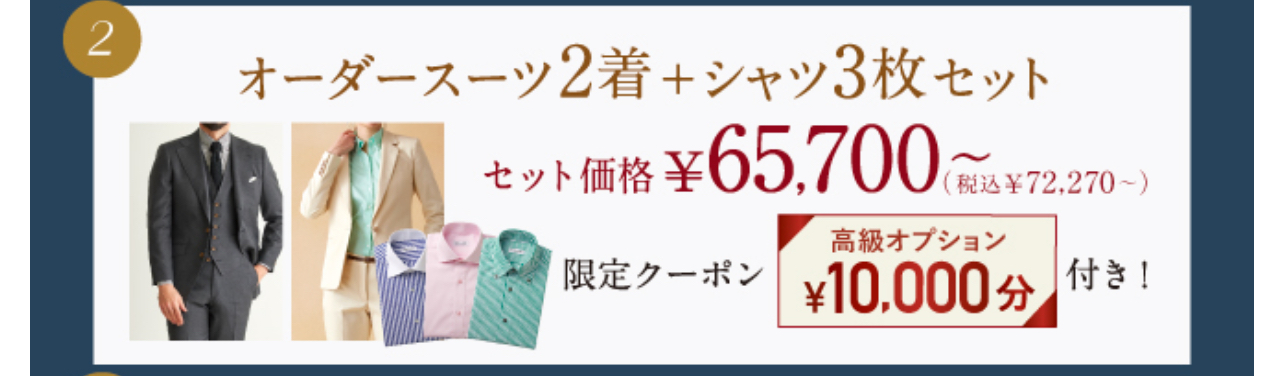 今月のフェアでスーツ2着とシャツ3枚ご購入いただくと