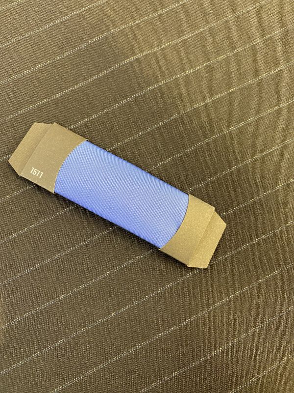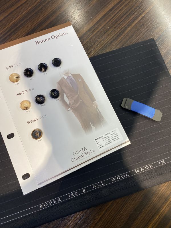 今回も釦は水牛釦にして、裏地はブルーにしようかと。この生地はよーく見るとストライプが2列になっていて、白と青のラインが入っていますので、そこに合わせてみようと思います。