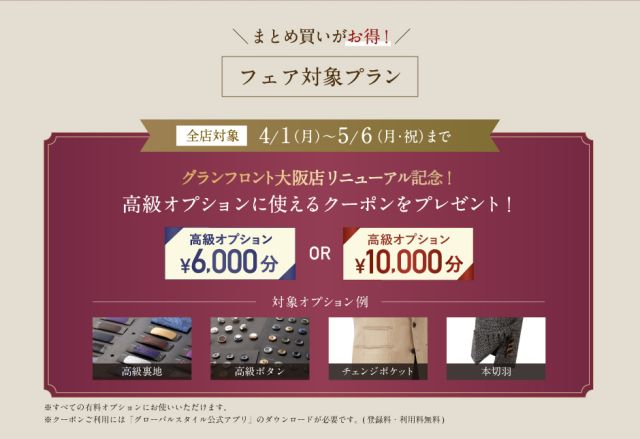 スーツ2着お求め頂くと高級オプション6000円分のクーポン