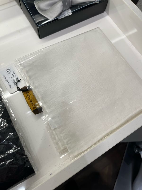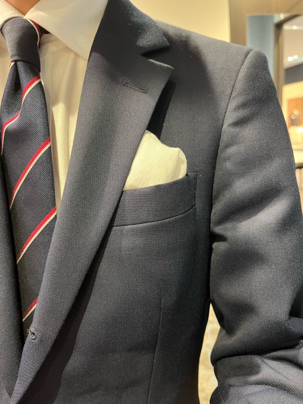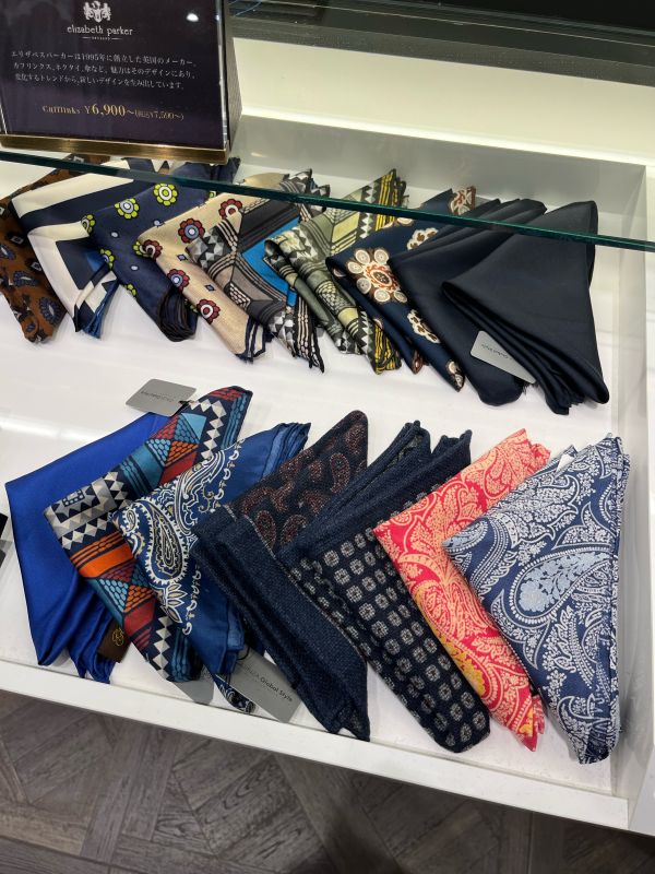 様々な種類がございます。スーツのお供にまずは麻の白いチーフからいかがでしょうか!