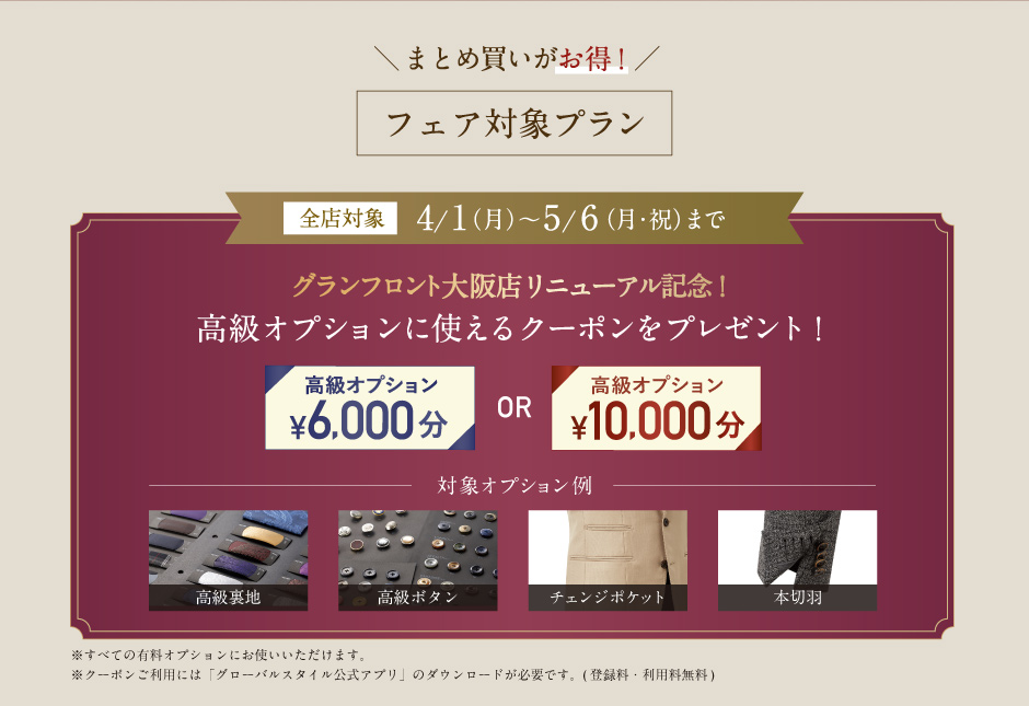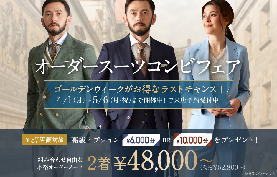 「オーダースーツ2着コンビ 48,000円+税~」をご注文頂いたお客様、またはご注文後にスーツお引き取りの為にご来店されたお客様に、当店近隣にある、『三井リパーク備後町3丁目駐車場』または『タイムズ御堂筋平野町』の駐車サービス券(1,200円分)をご進呈しております。