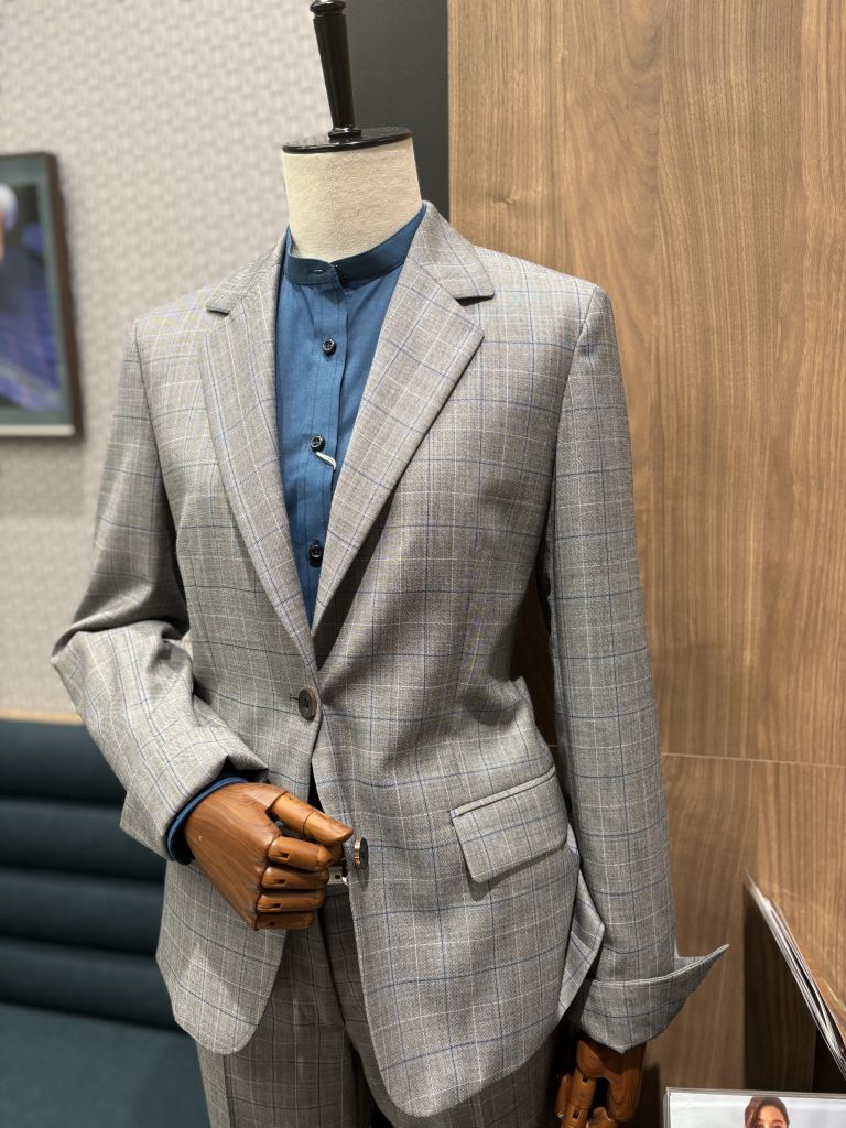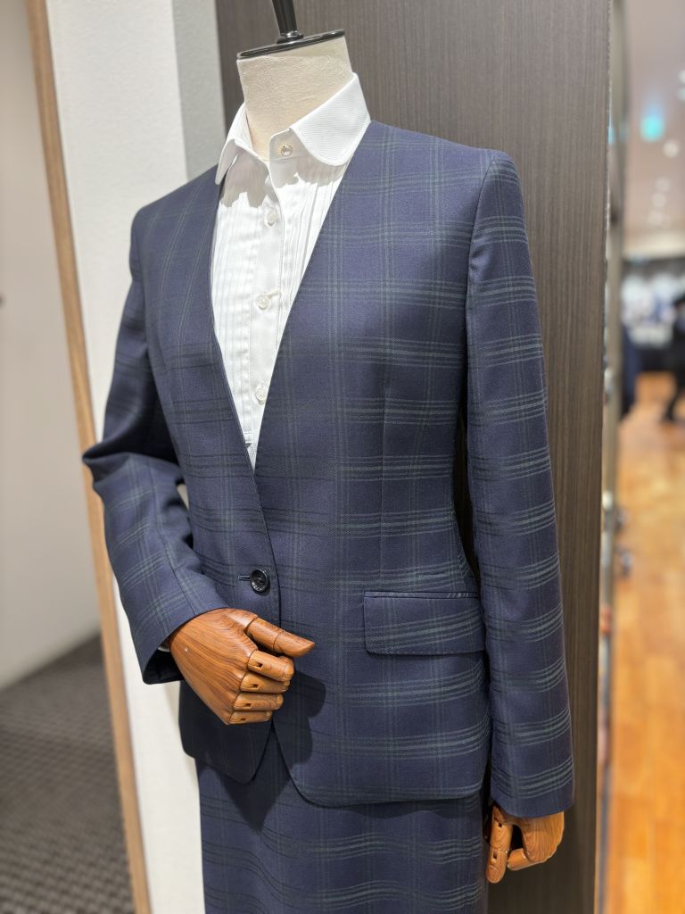 襟付よりカジュアルな印象なので、軽い雰囲気のスーツ、少しラフなスタイルでも