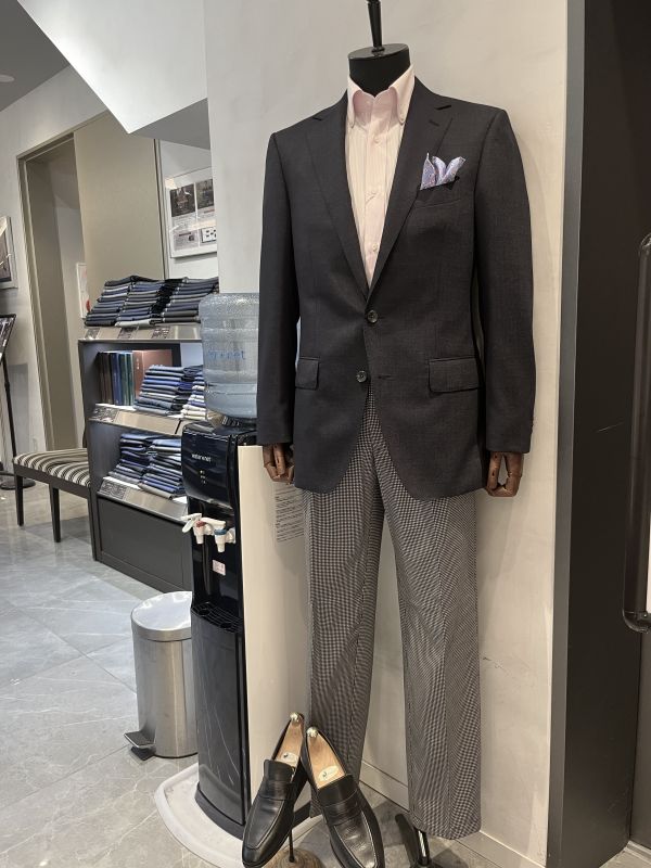 王道の紺ジャケにグレーパンツです。