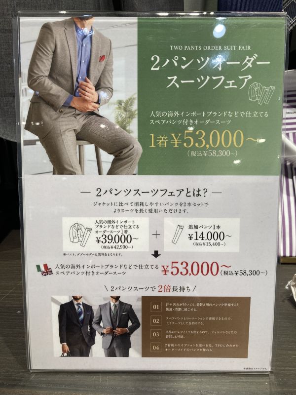 海外インポートブランドのスーツが、只今上下39,000+税~にパンツもう1本14,000+税~からで2パンツスーツ53,000+税からお仕立て可能です!