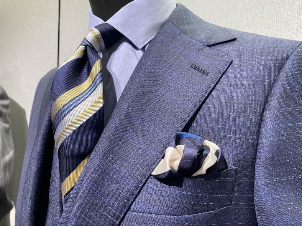 さて、スーツやジャケット着用時に胸ポケットにさり気なく忍ばせるポケットチーフ。