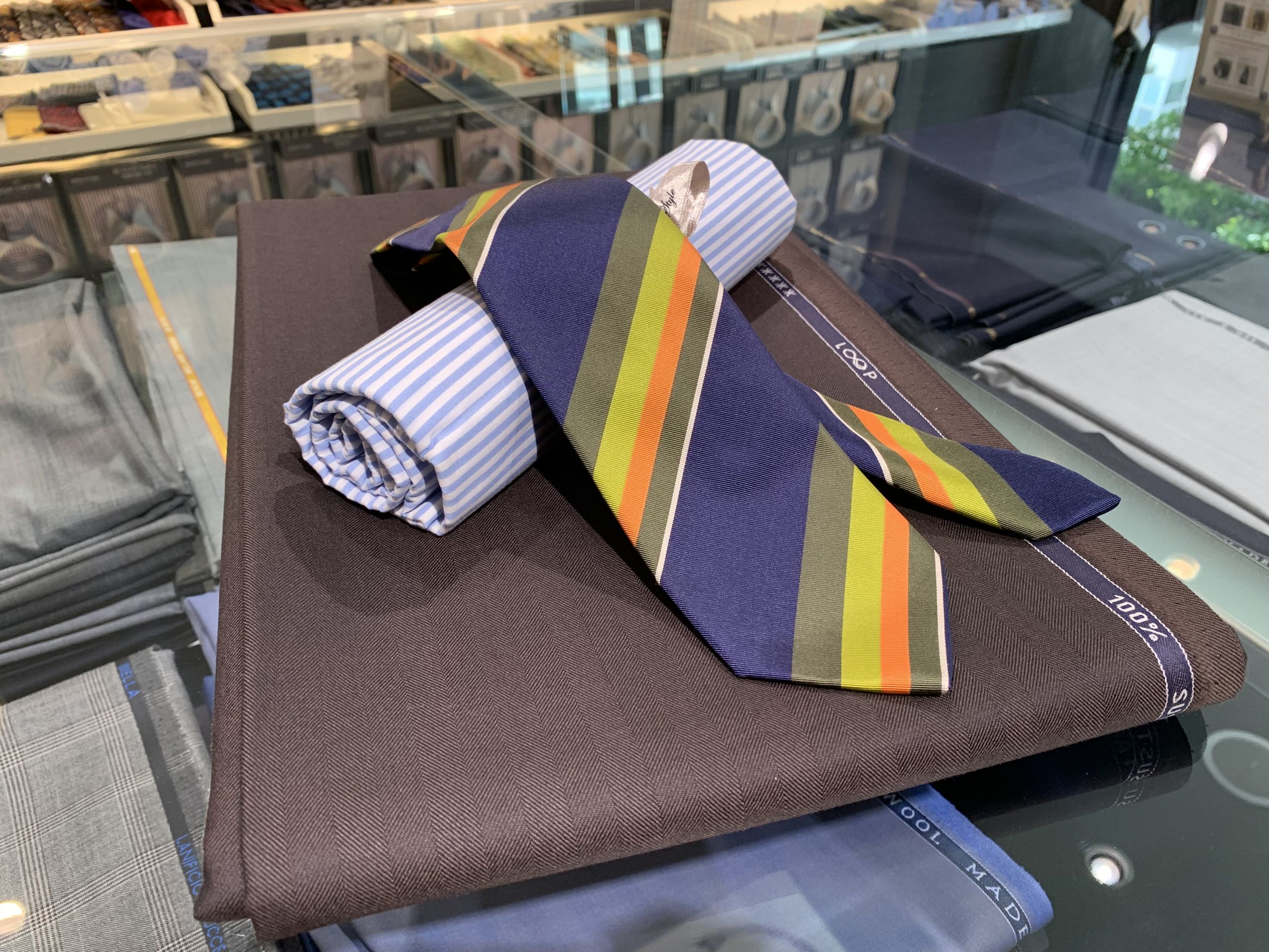 一枚目、二枚目で同じ生地をベースにシャツとネクタイを変えてみましたが、全然印象が違いますよね。