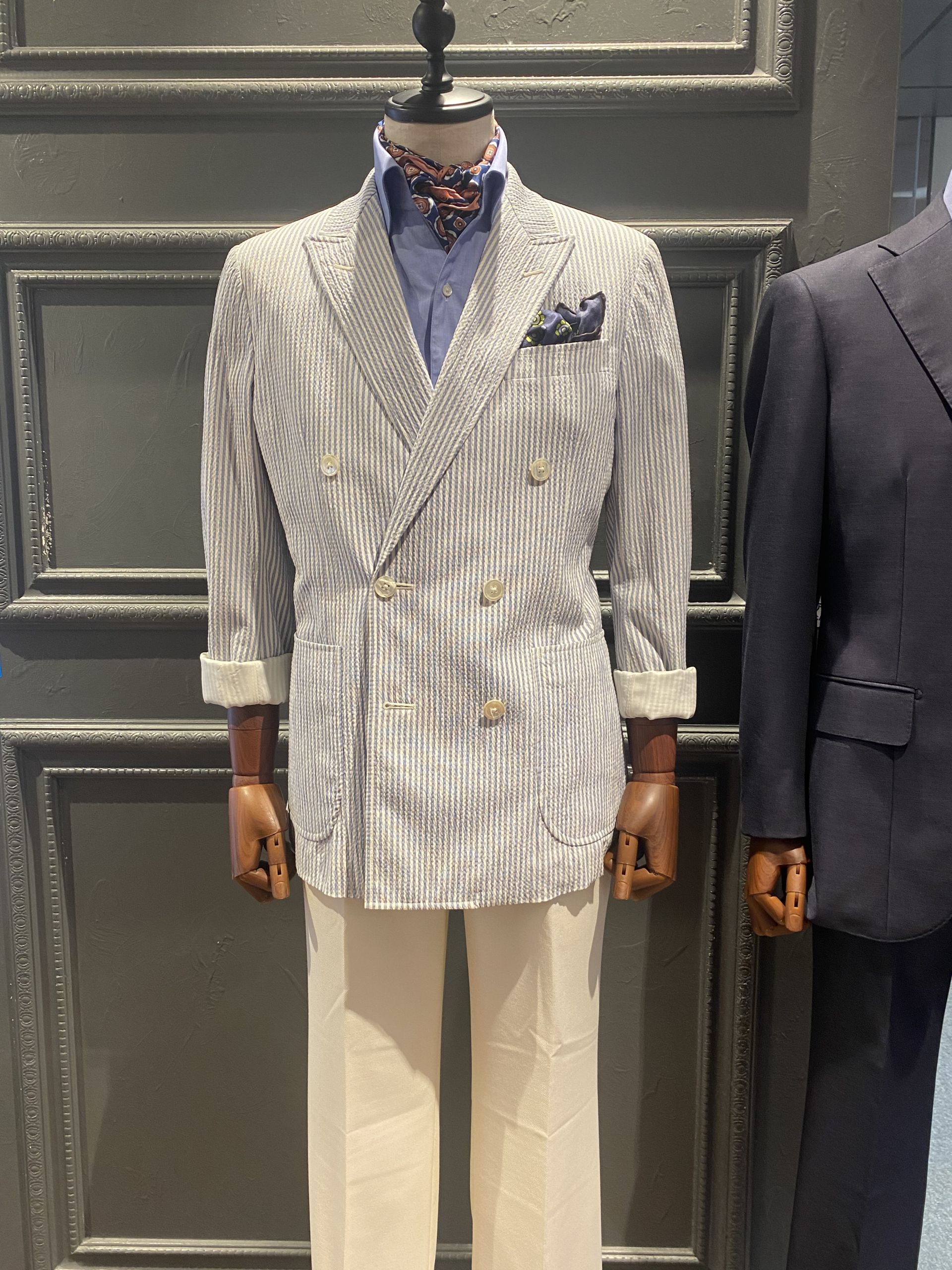 そこで今回は軽く羽織えるシアサッカージャケットとオープンワイドのワイシャツは開きすぎててあんまり…という方にお勧めのネッカチーフをご紹介します!