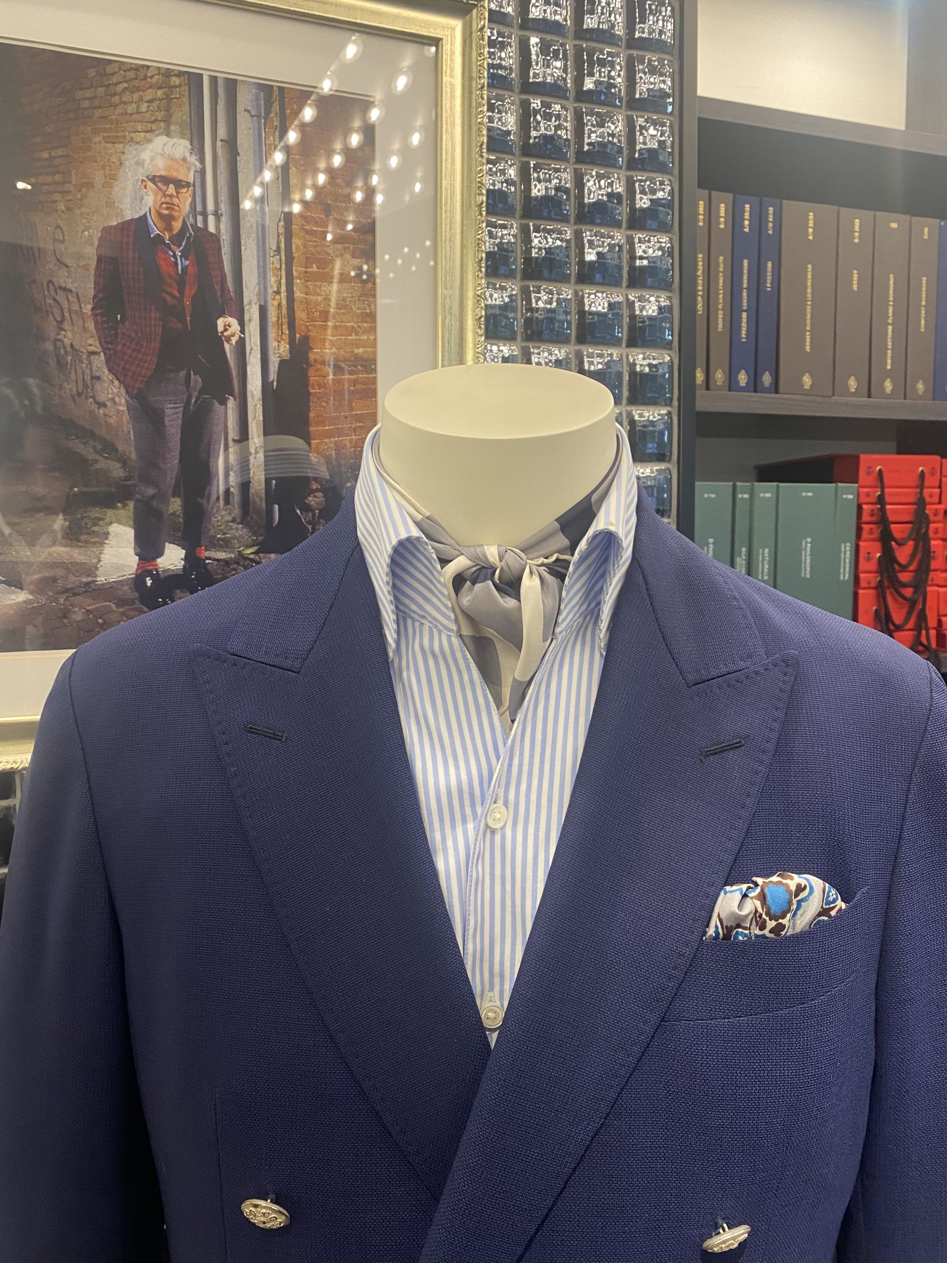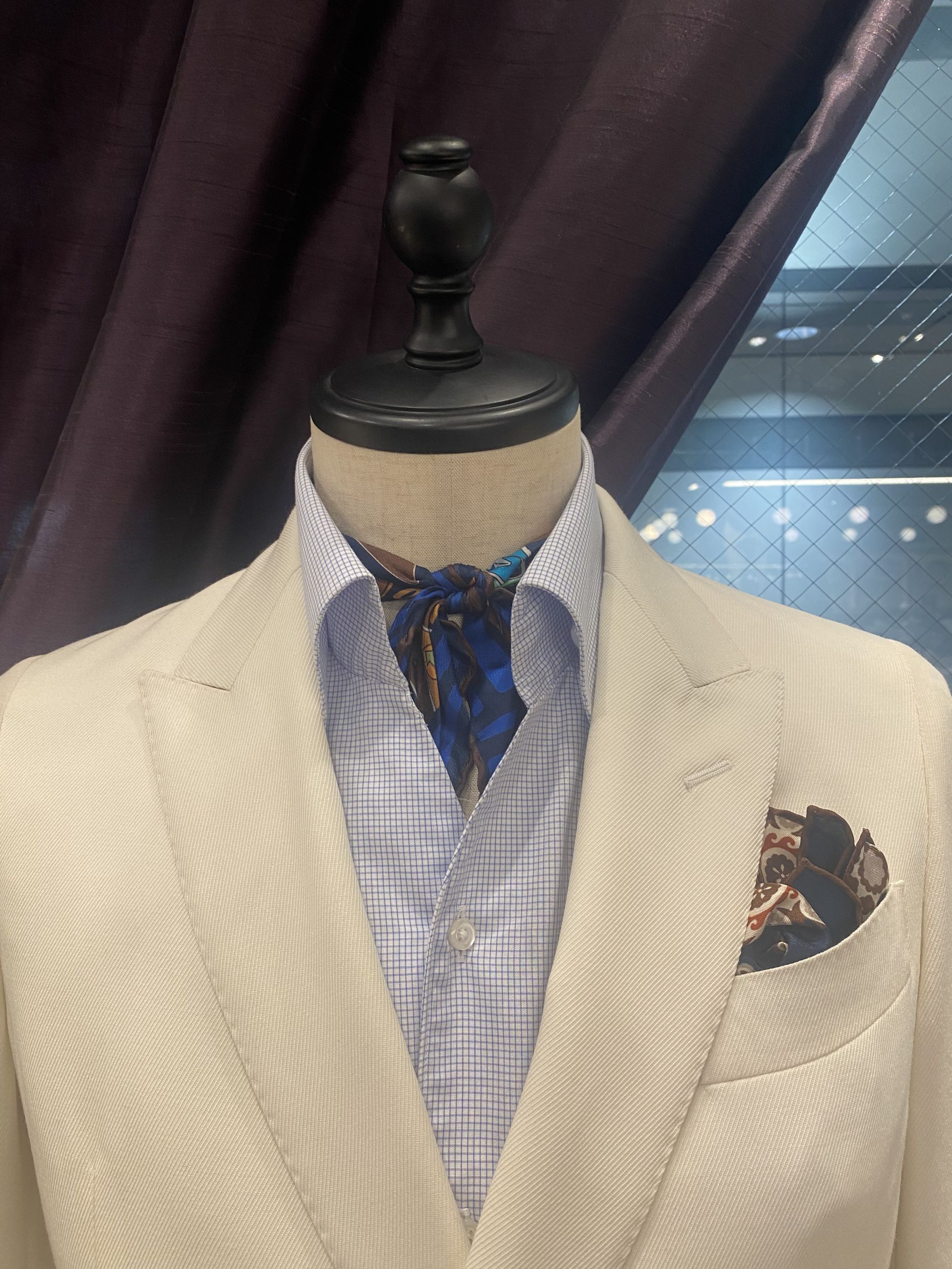 今日オープンワイドシャツを着せたトルソーにはネッカチーフを巻いております。