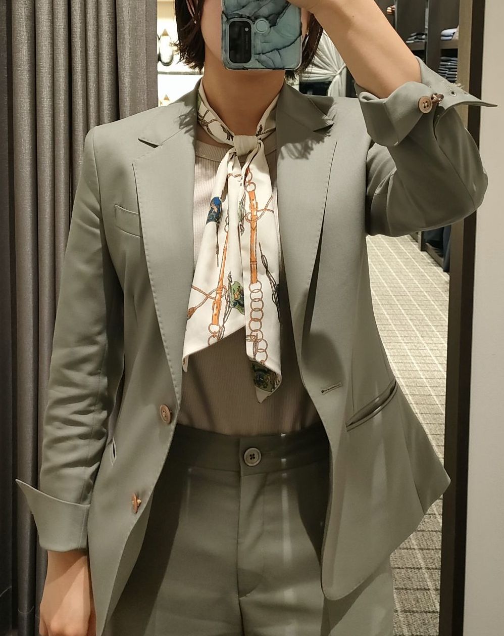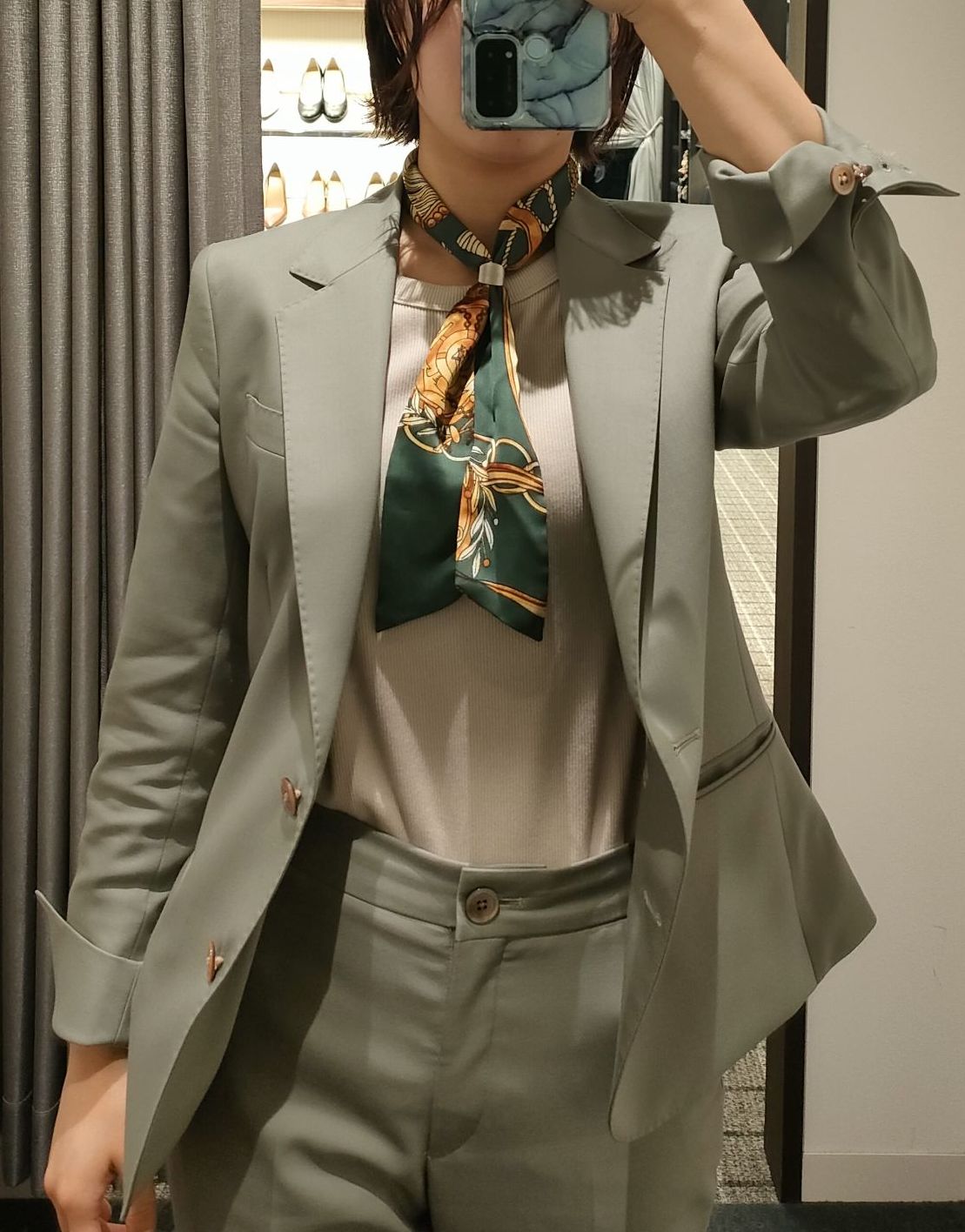 さて、本日はレディーススーツにスカーフコーデをご紹介したいと思います。
