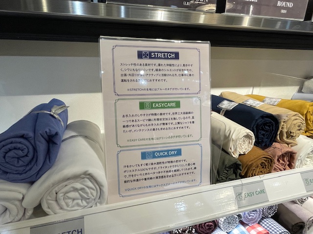取り扱い生地の機能をわかりやすく、説明したポップを設置しました。