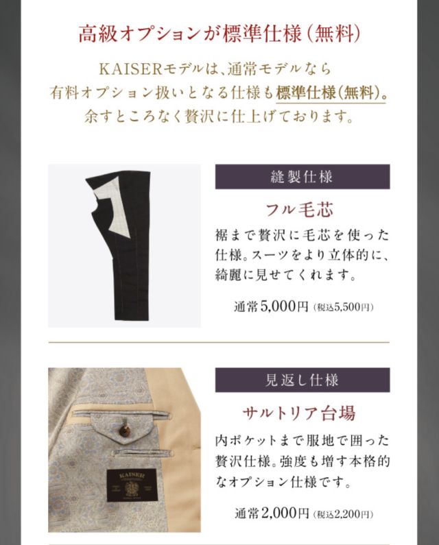 ただ今こちらの高級モデル、カイザーフェアというフェアを開催しており対象の生地を選んでくださったお客様には1万円でお仕立て頂くことができます!