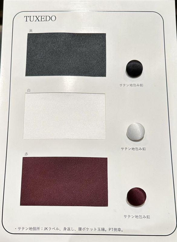 襟や釦などに使用するサテン生地も黒の他に、白色やワインレッド柄もご用意がございます!