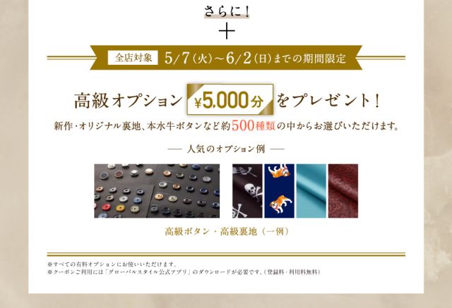 更に今だけ高級裏地やボタンなどに使えるオプション代5000円分プレゼント!
