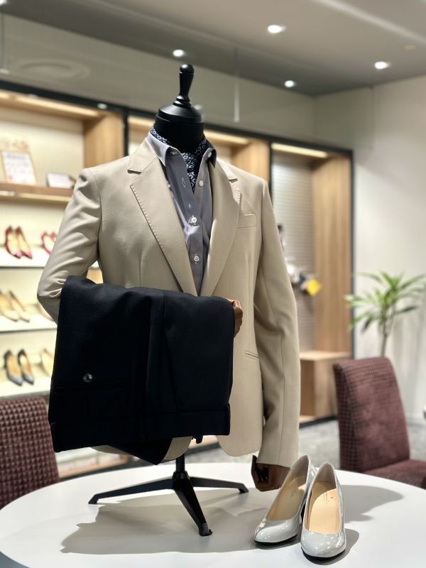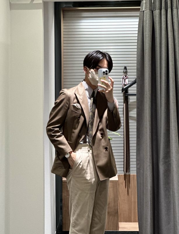 ベージュ系やハイトーンスーツを数着持っておくとこの様なワントーンコーデのジャケパンも組むことが出来て